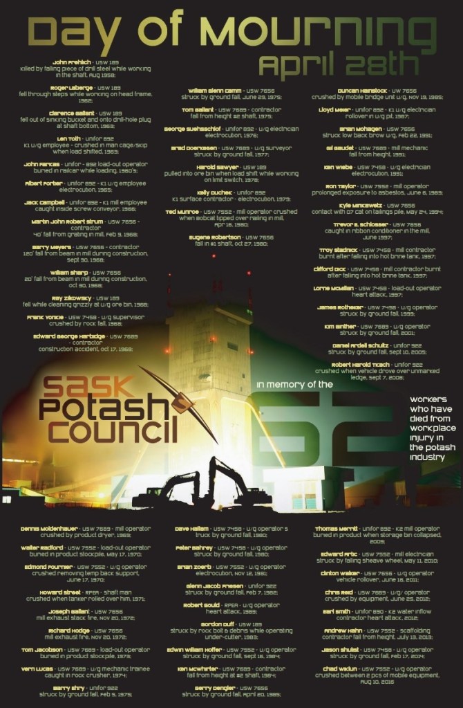 The Saskatchewan legislature will read the names of those who lost their lives to their work into the Provincial Record. The Canadian Labour Congress inscribes the names in the National Registry in Ottawa.